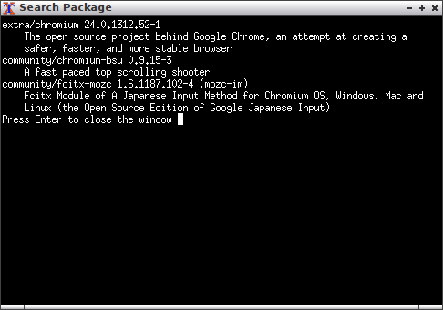 Ubuntu users might get a slight shiver at this point as the results appear in a terminal window. Functionally wise of course there is no difference. The terminal window shows you all the packages that are available and there is a clear instruction that to finish searching all you need to do is press enter on the keyboard.