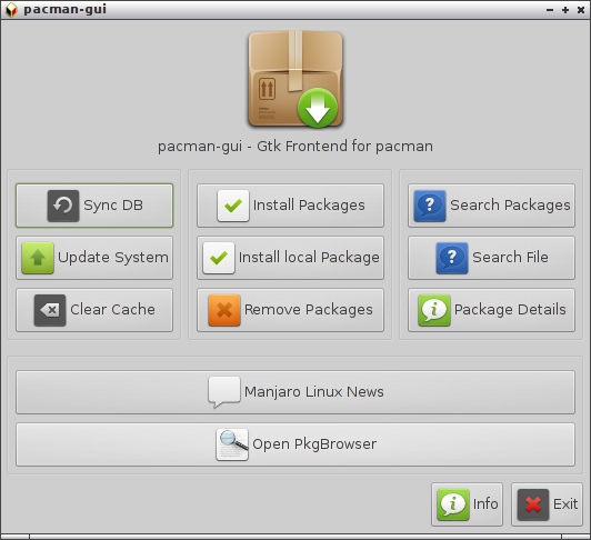 The main Pacman-gui screen has a number of buttons for doing various tasks.